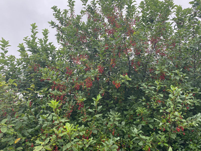Chokecherry is invaluable in our landscapes and creates a truly wonderful food source. They're called Chokecherries because of their astringency- the Gitksan peoples name for Chokecherry means "it makes your mouth and throat so that nothing will slip on it, which is a great description of how they make your mouth feel when eaten raw. They put on a show of blooms in the spring that perfume the air with an incredible fragrance. Their fruits are ready to eat in August once they've turned a dark dark red, almost black colour. At this point they have less astringency and more sweetness. They are fantastic in preserves, jellies, fruit leather, and beverages, but I learned the best way to eat them from foraging expert Linda Black Elk. She recommends grinding up the chokecherry fruit with their pits with a mortar and pestle until they're a paste. Then spread the paste out thinly on a tray and dry in the sun. The sun exposure and drying of the pits neutralizes their cyanide making it safe to eat. After drying, this is a lovely snack and the pits give the choke cherry fruits a nice almondy flavour. This is one of the traditional ways indigenous peoples process these fruits. Chokecherry is also incredibly hardy and feeds a ton of wildlife. They are absolutely filled with birds when the cherries are ripe. We certainly think they deserve a better name than 'Choke' cherry!