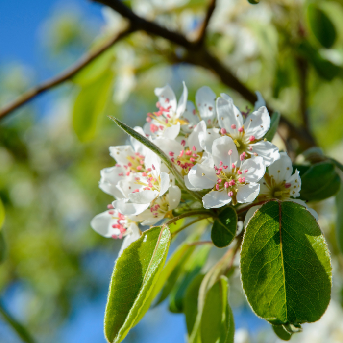 Pears have an upright growth habit, resulting in a taller height than apple trees, but with less width. They need well drained soil and full sun to grow well. Pear trees need another pear tree that is a different cultivar in order to cross pollinate and get fruit. Our pears are grown on standard Ussurian rootstock. Pear trees prefer well drained soil with moderate levels of fertility, and thrive best in full sun. It’s important to prune them every year in early spring and clean up fallen fruit and leaves and discard them. We also like to give them compost every year or two and then mulch with woodchips or leaves on top of the compost.