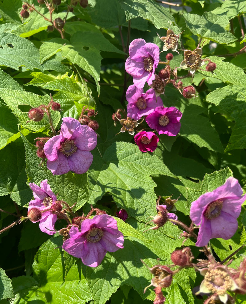 This lesser known species of the Rubus family produces delicious berries. They are reminiscent of raspberry jam. They are also very ornamental with their pink blossoms, feeding a host of pollinators for months on end. They start blooming in July and bloom and create berries all the way until frost occurs. They would be worth growing for their flowers alone- the berries are a lovely bonus.